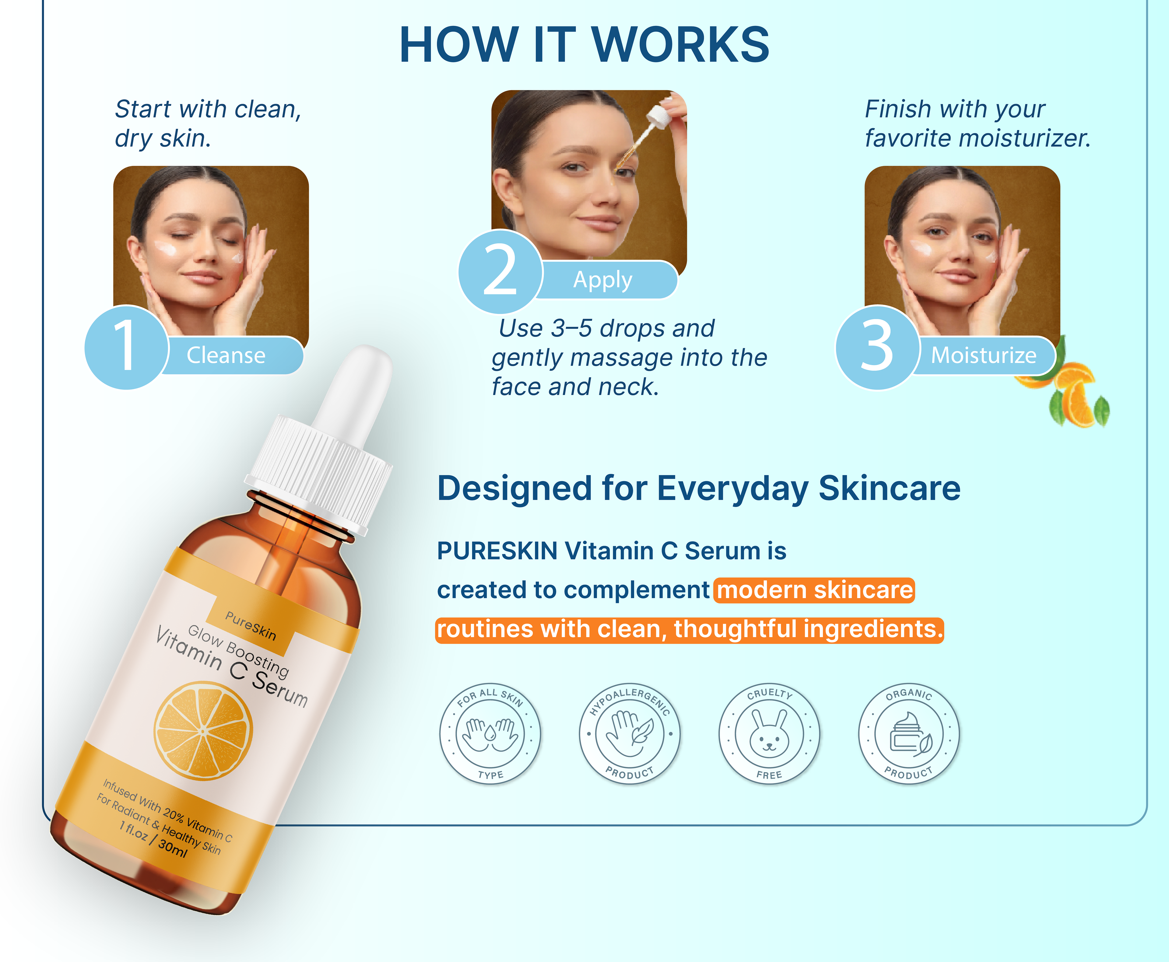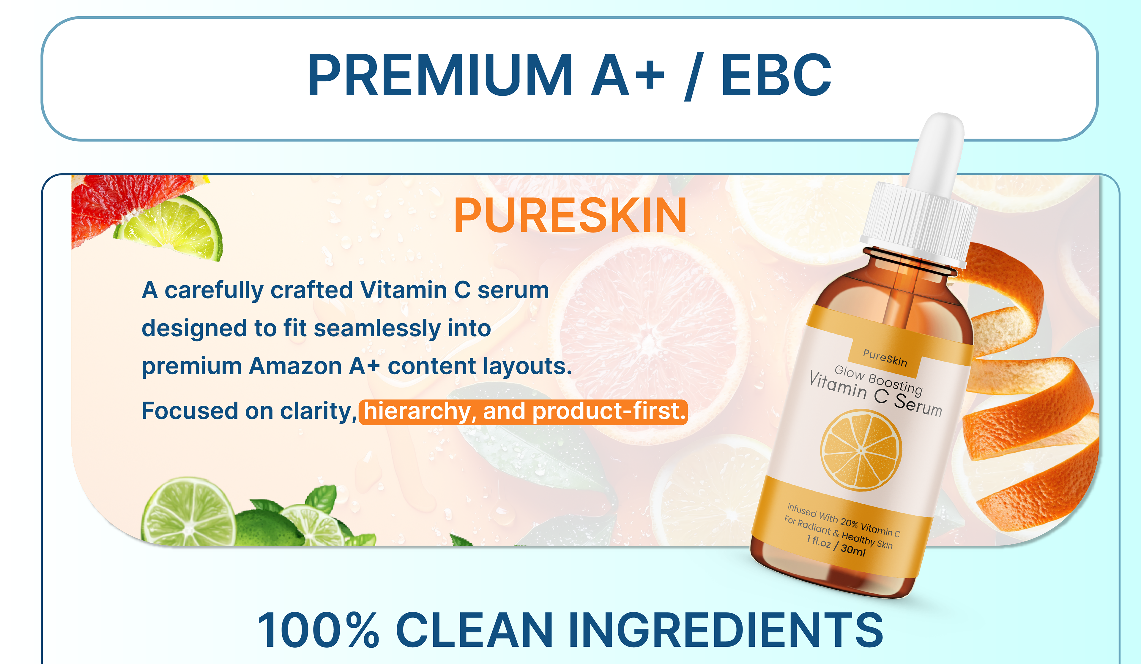 This project presents a conceptual visual system for Amazon Listing Images and Premium A+ / EBC content designed for a skincare serum brand named PURESKIN. The goal was to create a clean, modern, and conversion-focused product presentation suitable for e-commerce environments.